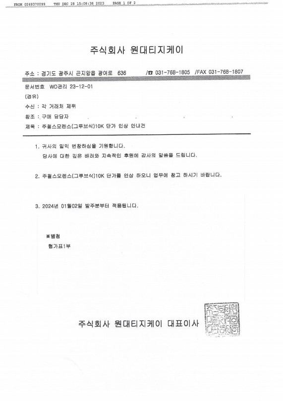 원대티지케이 "주철스모렌스(그루브식)10K 단가 인상 안내건" 공문