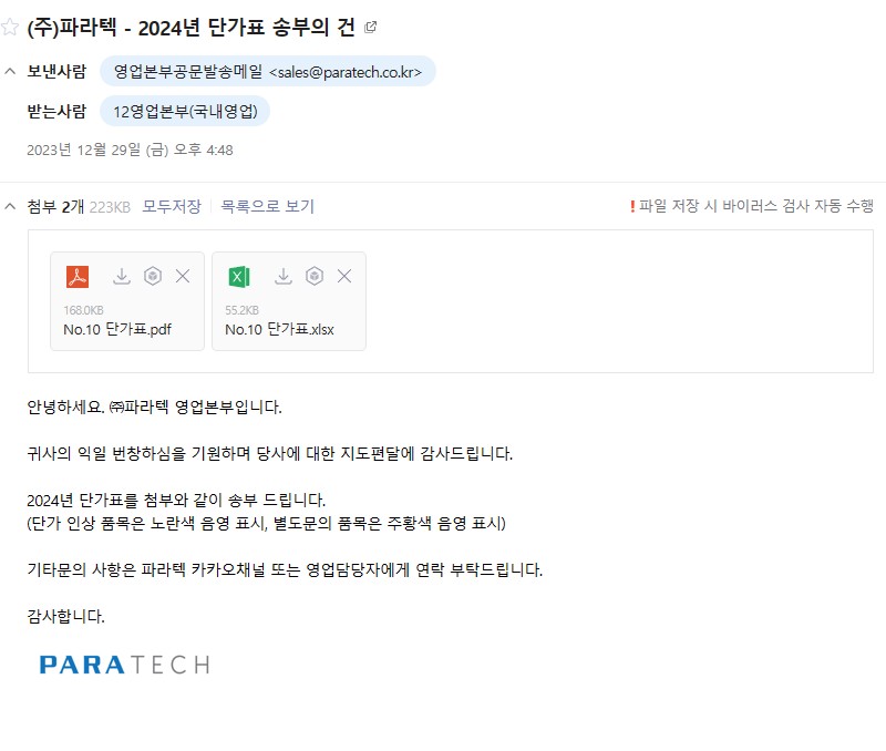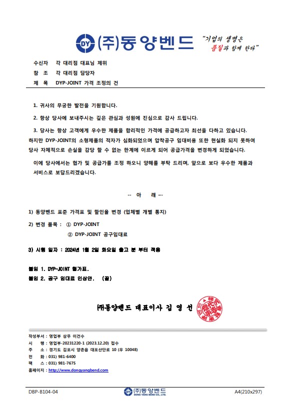 동양벤드 "압착부속 공급단가 인상의 건" 공문
