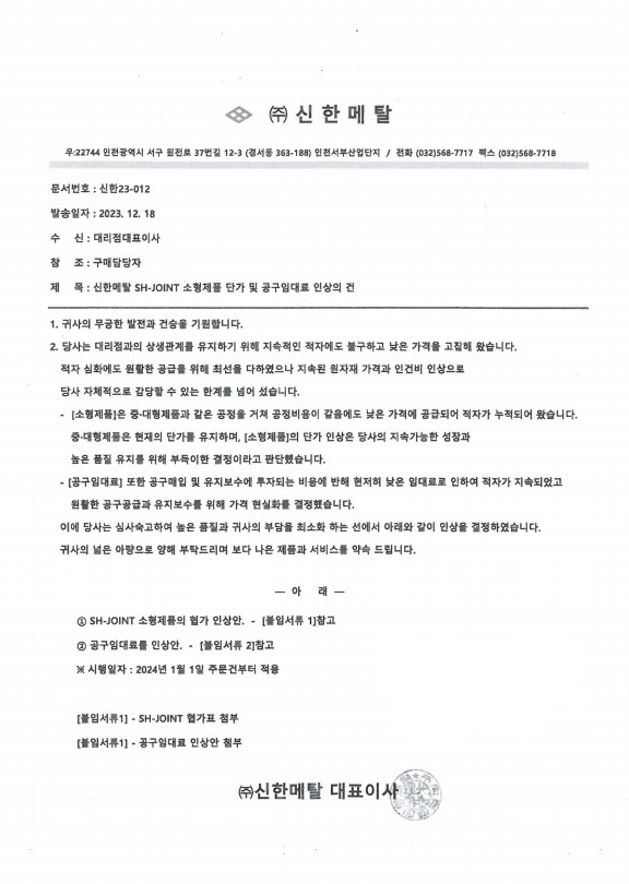 신한메탈 "압착부속 공급단가 인상의 건" 공문