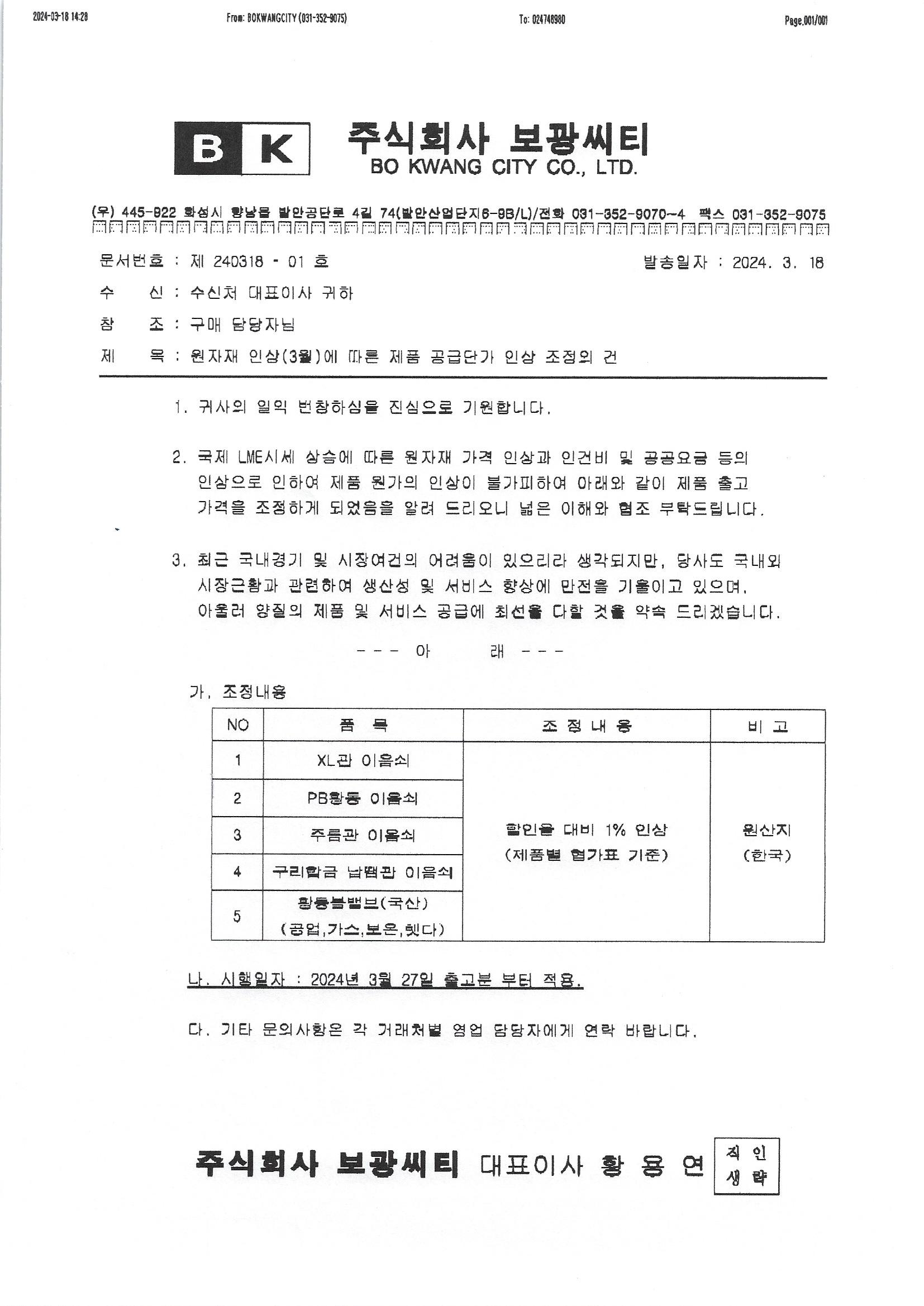 보광씨티 "원자재 인상(3월)에 따른 제품 공급단가 인상 조정의 건